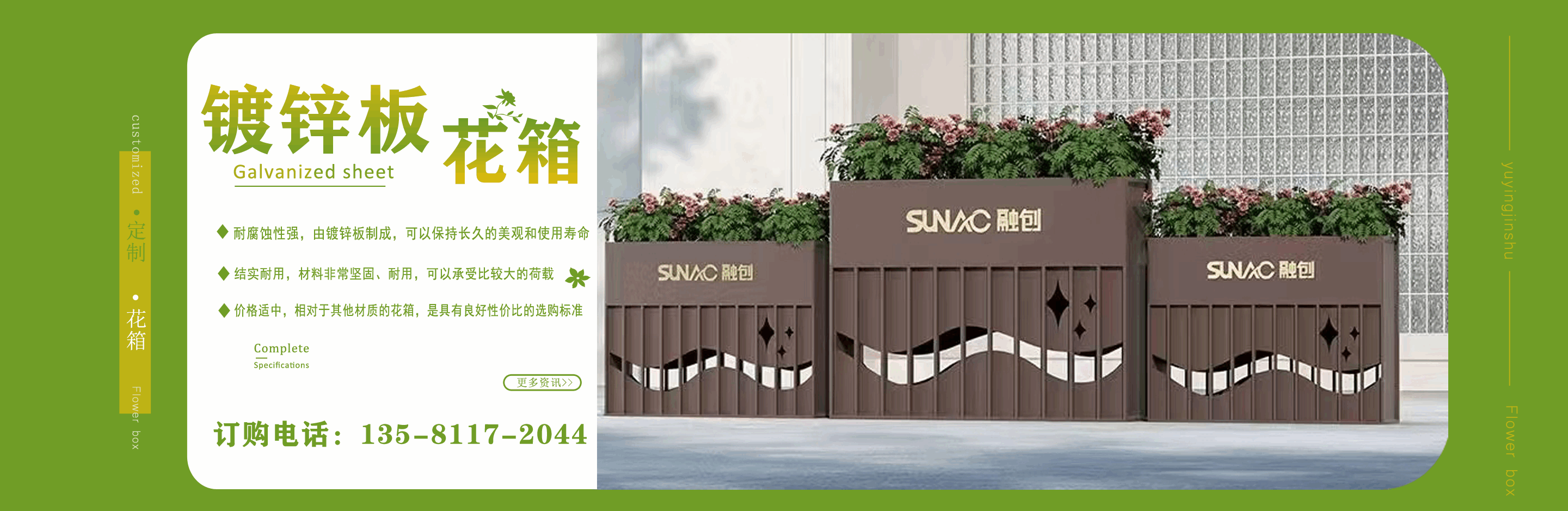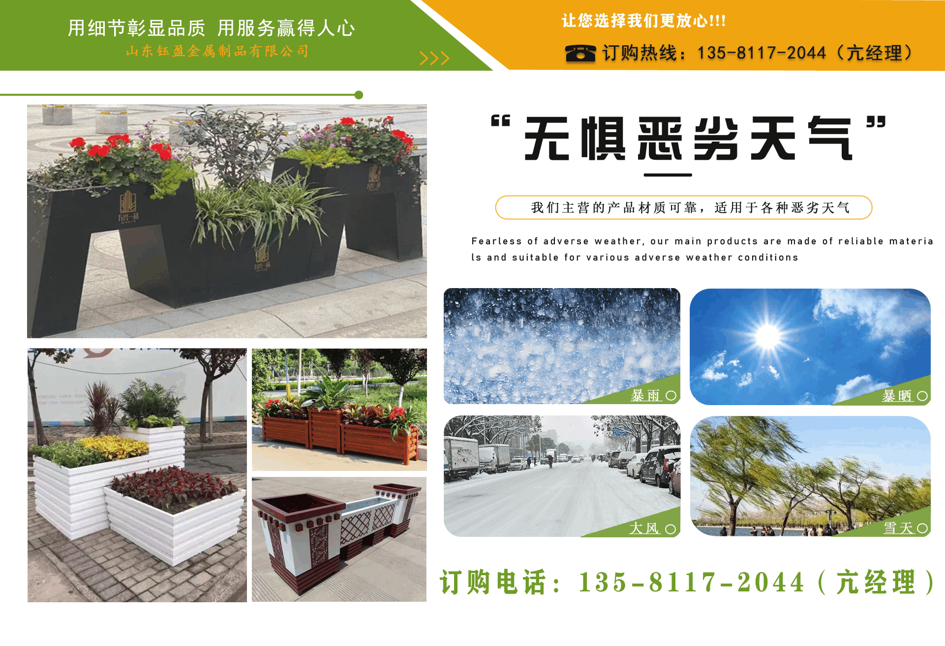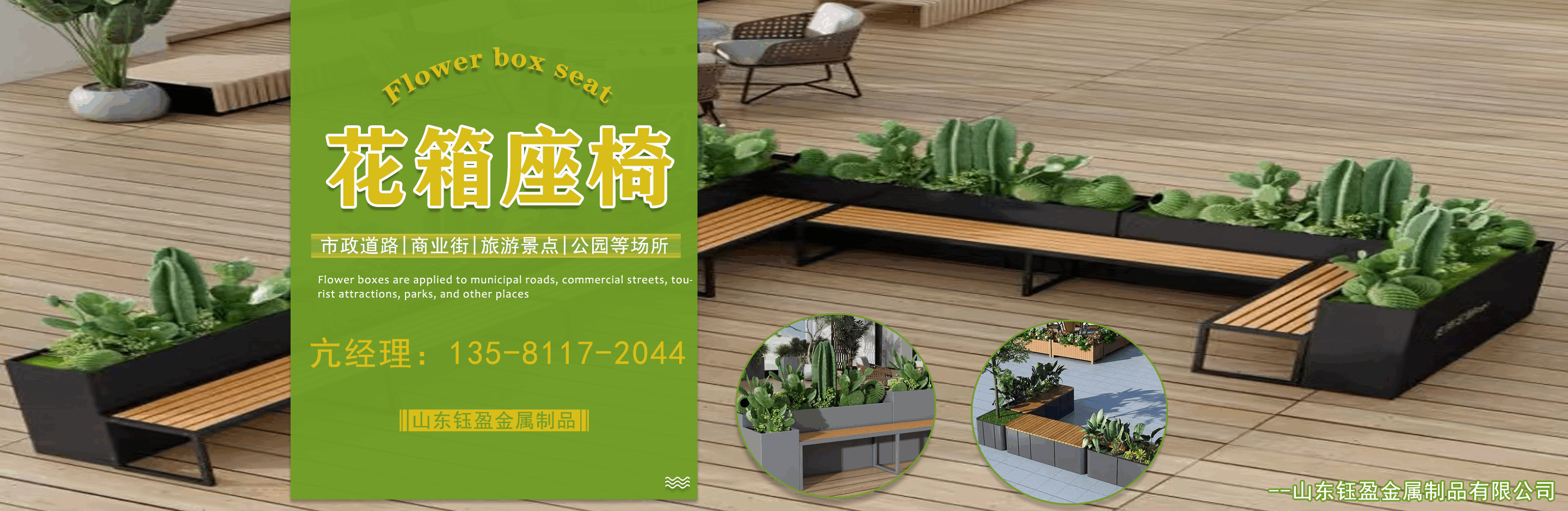 山東鈺盈金屬制品有限公司主營鍍鋅板花箱,道路隔斷花箱,定制花箱,戶外道路花箱,花箱座椅等產品,產品結構合理、性能優良,具有強度高、耐腐蝕、抗老化、隔熱隔音、節約能源、外形美觀、使用壽命長等優點,深受國內外客戶認可?! ∥覀兏鶕蛻羲诔鞘械奈幕卣鳎圃斐龇袭數爻鞘形幕瘹庀⒌淖匀涣Ⅲw、觀賞性強的花箱產品成為城市里一道靚麗的風景線?! 」緦嵭姓\實、公正、守信、價格合理、平等互利?! 」緫{借雄厚經驗實力,恪守誠信為本的原則,得到了眾多客戶的信賴,并在業界獲得良好的口碑。建立了穩固的合作關系,隨著業務的不斷發展和壯大,合作伙伴的范圍也在不斷擴大。我們熱情盼望與您的合作,為社會的可持續發展獻上一份努力。...